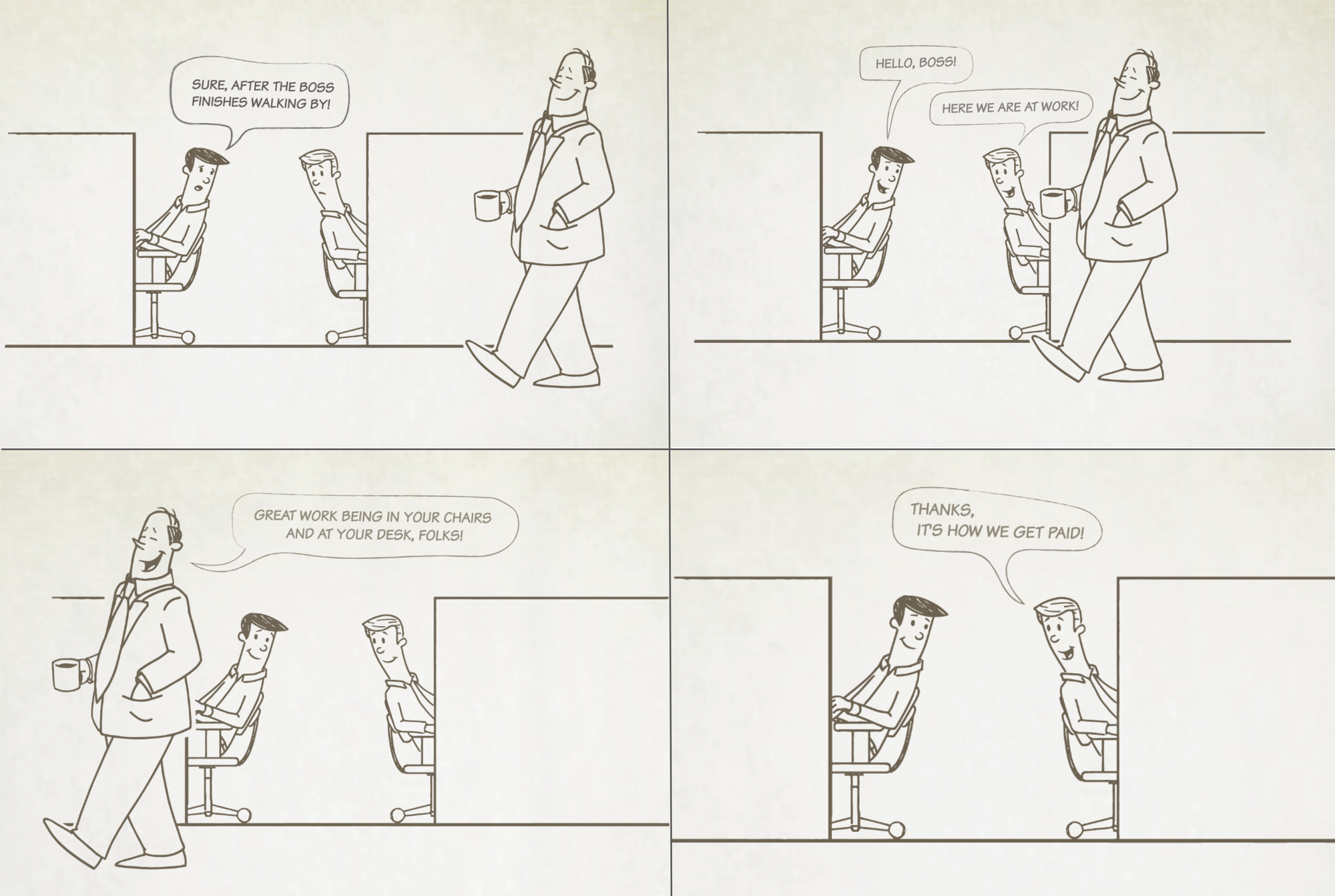 The site was mimicked the look and feel of vintage projector screen, using browser animations to create a fully-immersive retro vibe. Tongue-in-cheek writing that evoked a tone somewhere between Dilbert and The Family Circus, the blind innocence of corporate malaise with lampooned with deadly satire. Theme after theme, we created comics to highlight the absurdity we put up with in the common workplace.