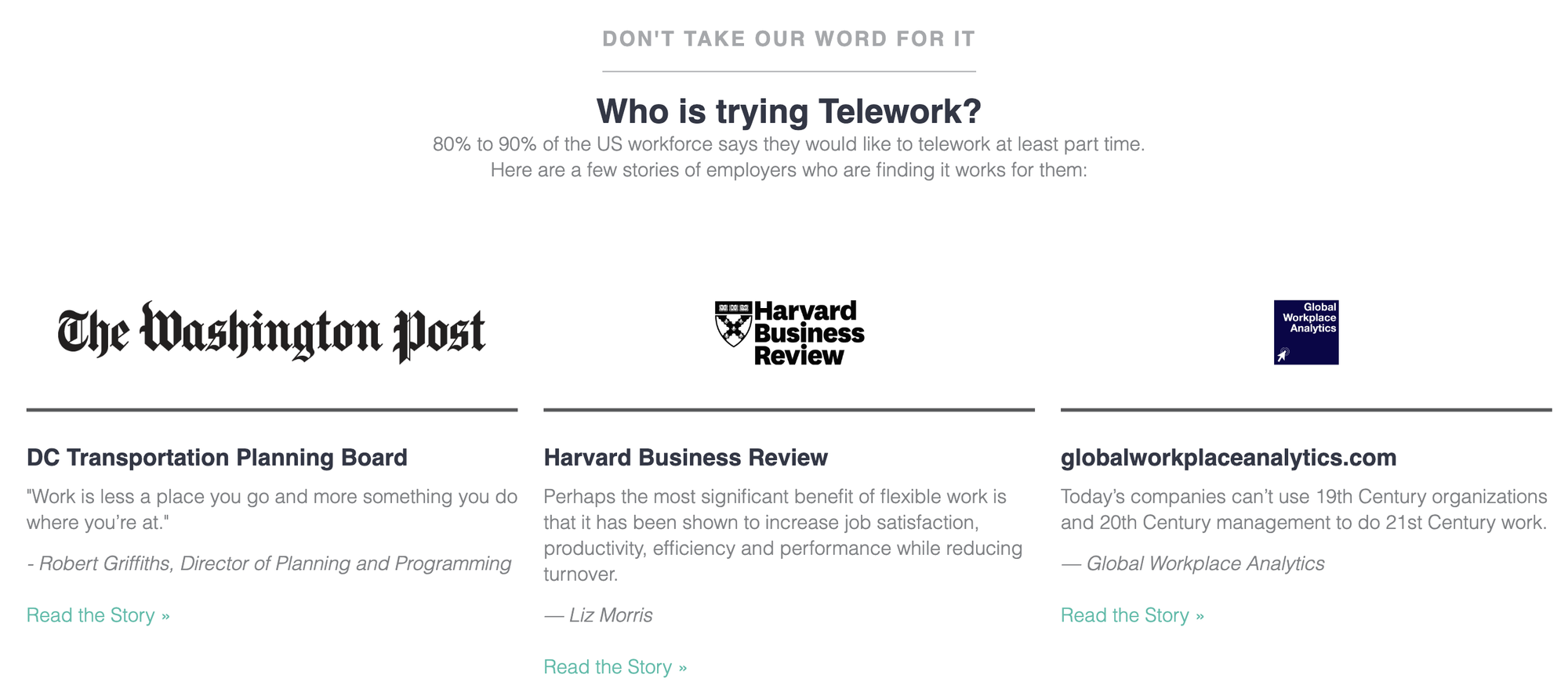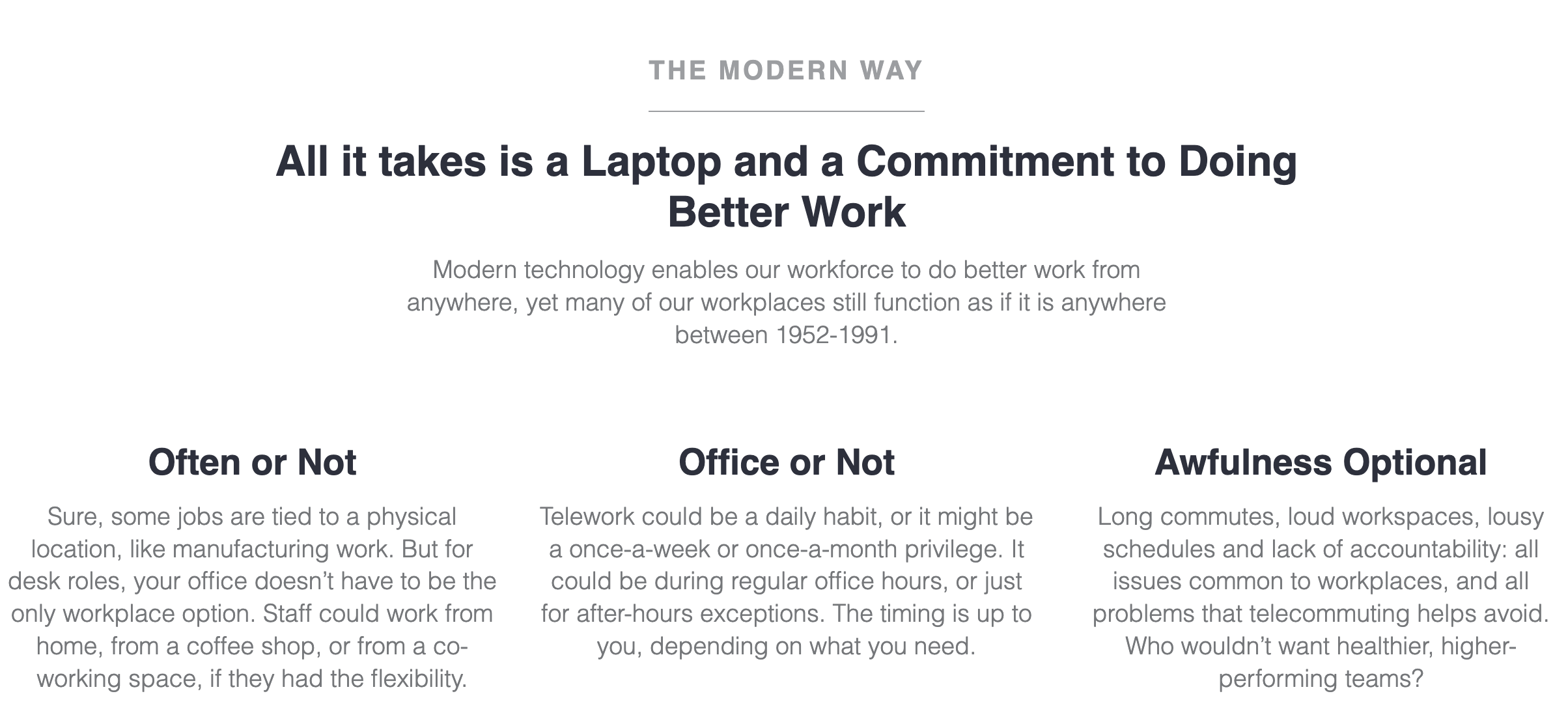 The site ends with a gloriously necessary call-to-action for support in transitioning your workforce to a telework model.